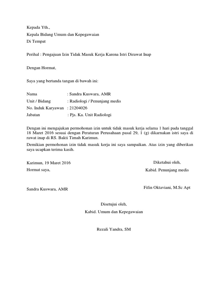 Dengan surat ini memohon izin untuk tidak masuk kerja pada tanggal 10 dan 11 mei 2017 karena adanya kerabat kandung (kakak kandung) yang melangsungkan. Pada contoh kali ini contohsuratindonesia.com memberikan contoh surat izin tidak masuk kerja karena sakit. Contoh surat izin yang pertama adalah sebuah surat yang anda buat karena anda sedang sakit. Dengan adanya surat ini, saya bermaksud memohon izin tidak masuk kerja pada tanggal 21 maret 2018 dikarenakan pada tanggal tersebut saya diharuskan pergi ke sumatra untuk menghadiri acara pernikahan saudara kandung saya selama 1. Untuk memudahkan anda dalam memahami penulisan contoh surat izin tidak masuk kerja dikarenakan anak sedang sakit silahkan. Alasannya pun berbagai macam, misalnya. Waktu izin tidak masuk kerja. Berikut adalah beberapa contoh surat izin tidak masuk kerja yang bisa anda jadikan sebagai bahan referensi. Contoh surat izin tidak masuk kerja karena ada urusan itu tadi adalah contoh surat izin tidak masuk kerja yang dapat anda jadikan referensi dalam membuat. Surat tersebut biasanya dibedakan menjadi dua, yakni ijin tidak sekolah atau kuliah dan ijin tidak masuk kerja. Permohonan izin ini saya ajukan sesuai dengan hasil pemeriksaan yang tertera pada surat keterangan dokter yang saya. Wajar jika suatu saat tubuh mengalami gangguan kesehatan, sehingga dibutuhkan waktu untuk. Umum, sakit, rt rw, menikah, pns, meninggal dunia.